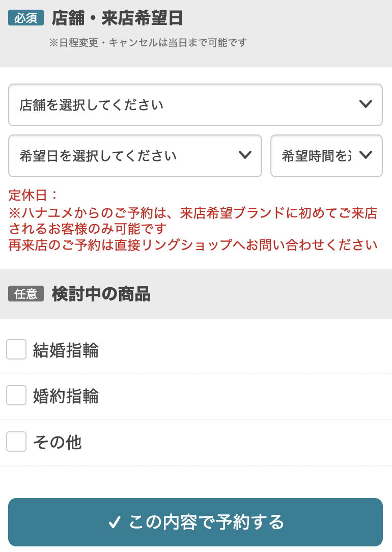 来店予約フォームでは、名前・希望店舗・来店日時・目的(婚約指輪・結婚指輪など)を入力します。